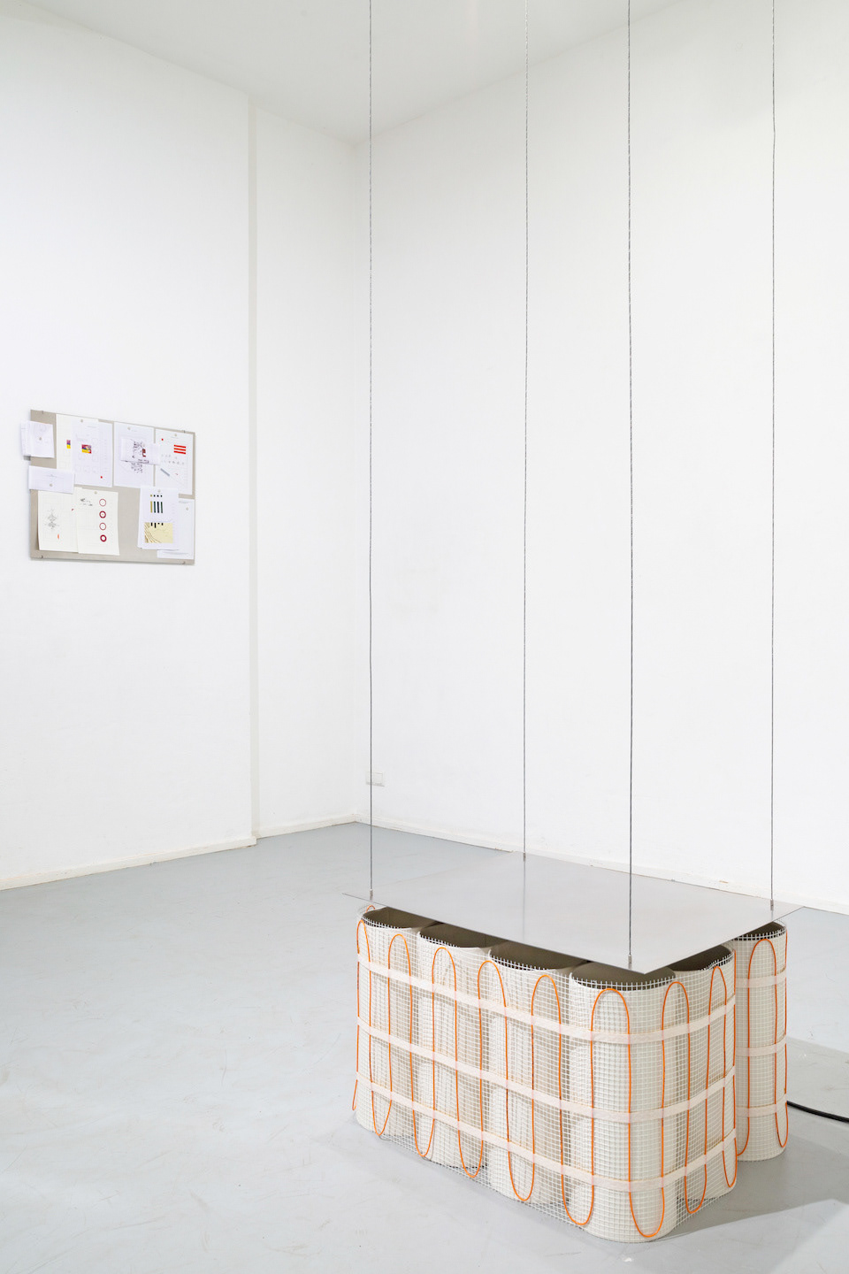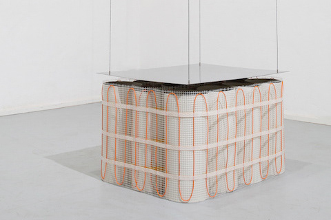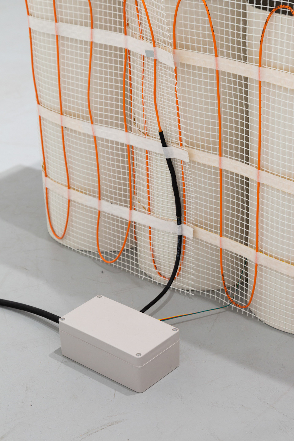 Porcelain, heat mattress, thermostat, aluminium, steel cables, colour pencils on paper, aluminium, magnets