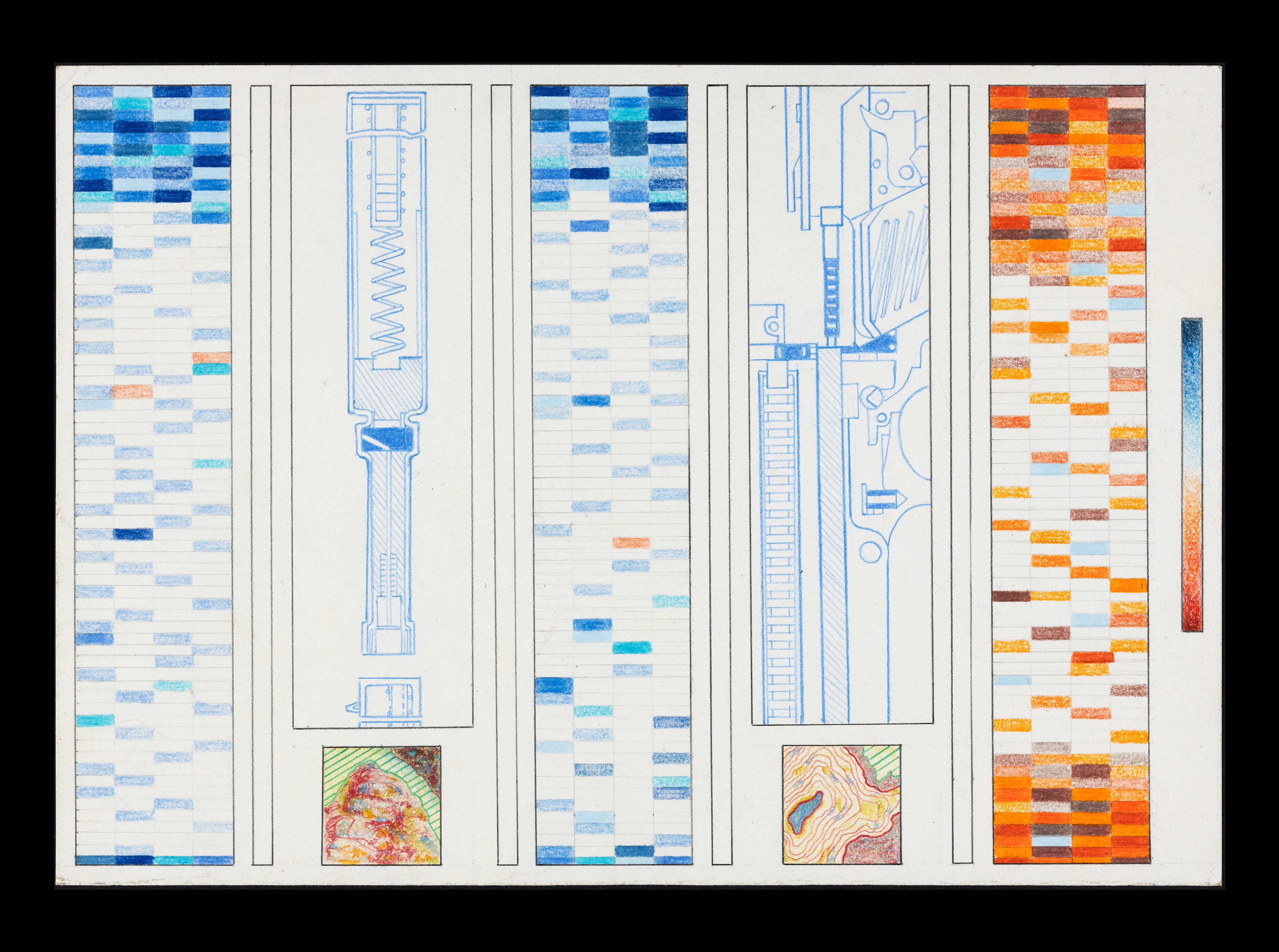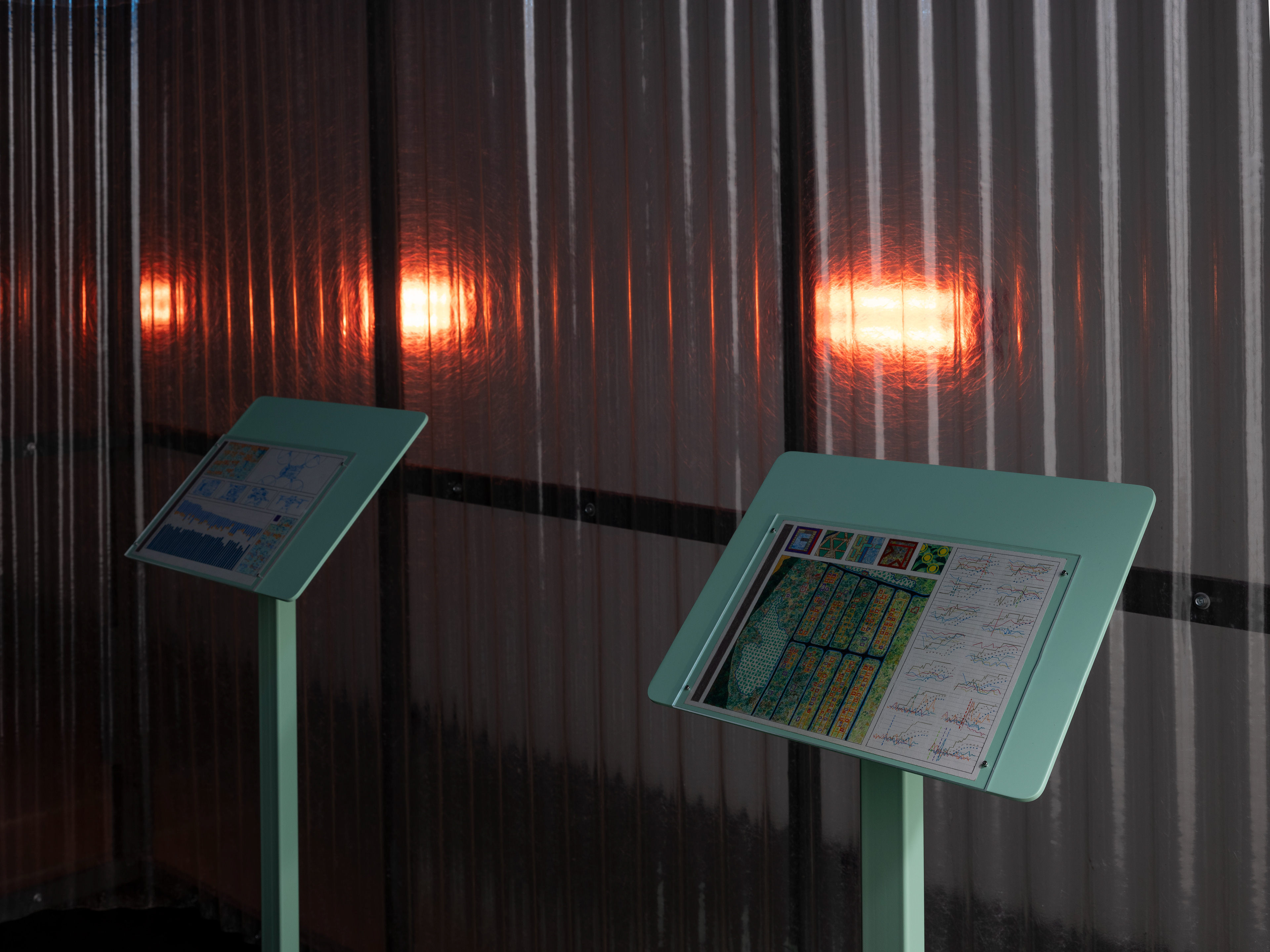 Corrugated plexiglass, wood, rubber flooring, heaters, lacquered metal and colour pencils on paper.